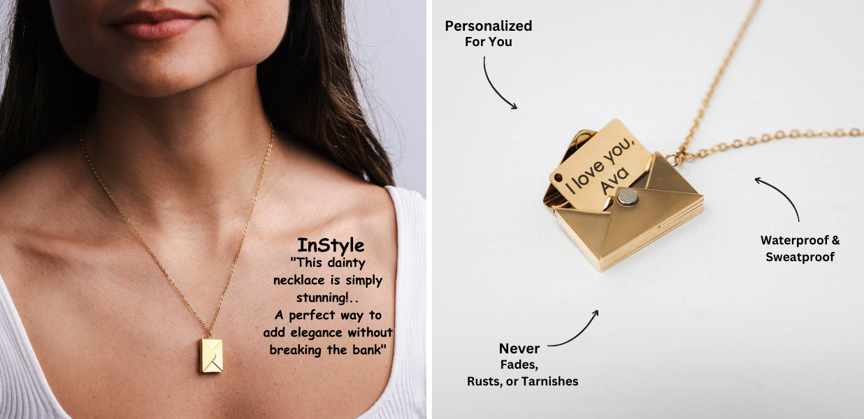 Our Love Letter Necklace is a timeless keepsake that carries the words closest to your heart. Its elegant envelope pendant opens to reveal a personalized message, making it uniquely yours.